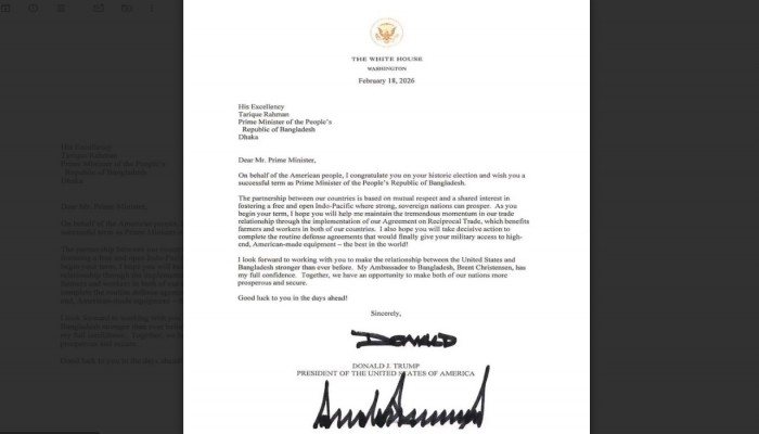 গত ১৮ ফেব্রুয়ারি হোয়াইট হাউস থেকে পাঠানো এক চিঠিতে এই বার্তা দেন ডোনাল্ড ট্রাম্প। বাংলাদেশের পররাষ্ট্র মন্ত্রণালয়ের এক্স হ্যান্ডেলে (সাবেক টুইটার) চিঠিটি প্রকাশ করা হয়েছে।