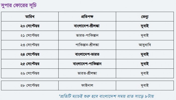 আফগানদের বিদায়ের পাশাপাশি ‘বি’ গ্রুপ থেকে শ্রীলঙ্কা ও বাংলাদেশ সুপার ফোরে পা রাখে। এর আগেরদিনই নিশ্চিত হয়ে যায় ‘এ’ গ্রুপ থেকে পরের রাউন্ডে ওঠা দল। সেখানে অবশ্য খুব একটা লড়াই জমেনি। ভারতের পর শেষ চারে ওঠা পাকিস্তান যদিও কিছুটা ভুগেছে তুলনামূলক দুর্বল প্রতিপক্ষ সংযুক্ত আরব আমিরাতের বিপক্ষে।